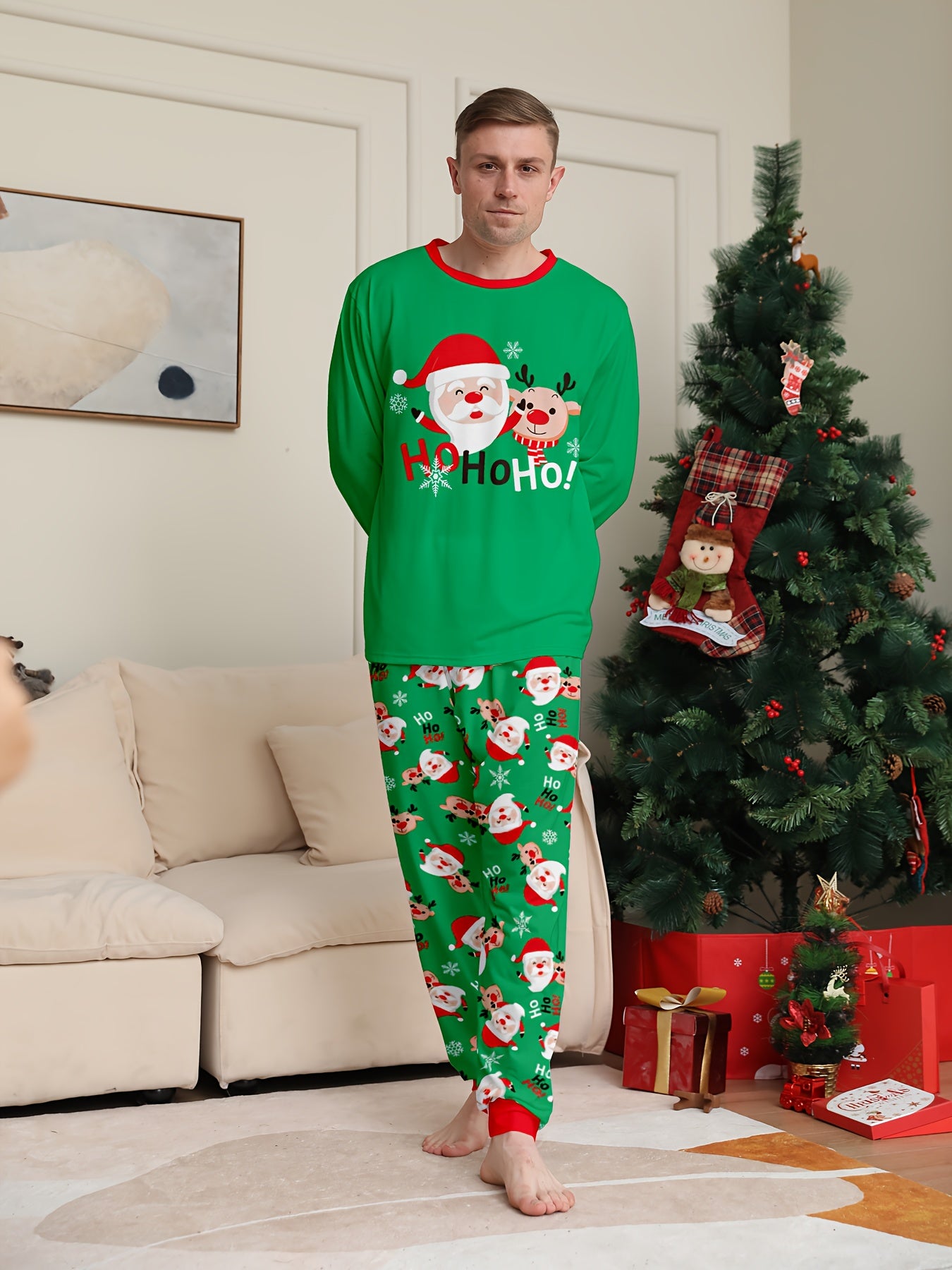 Ensemble pyjama de Noël unisexe (homme/femme) manches longues et pantalon, imprimé Père Noël, rennes et flocons de neige, col rond.