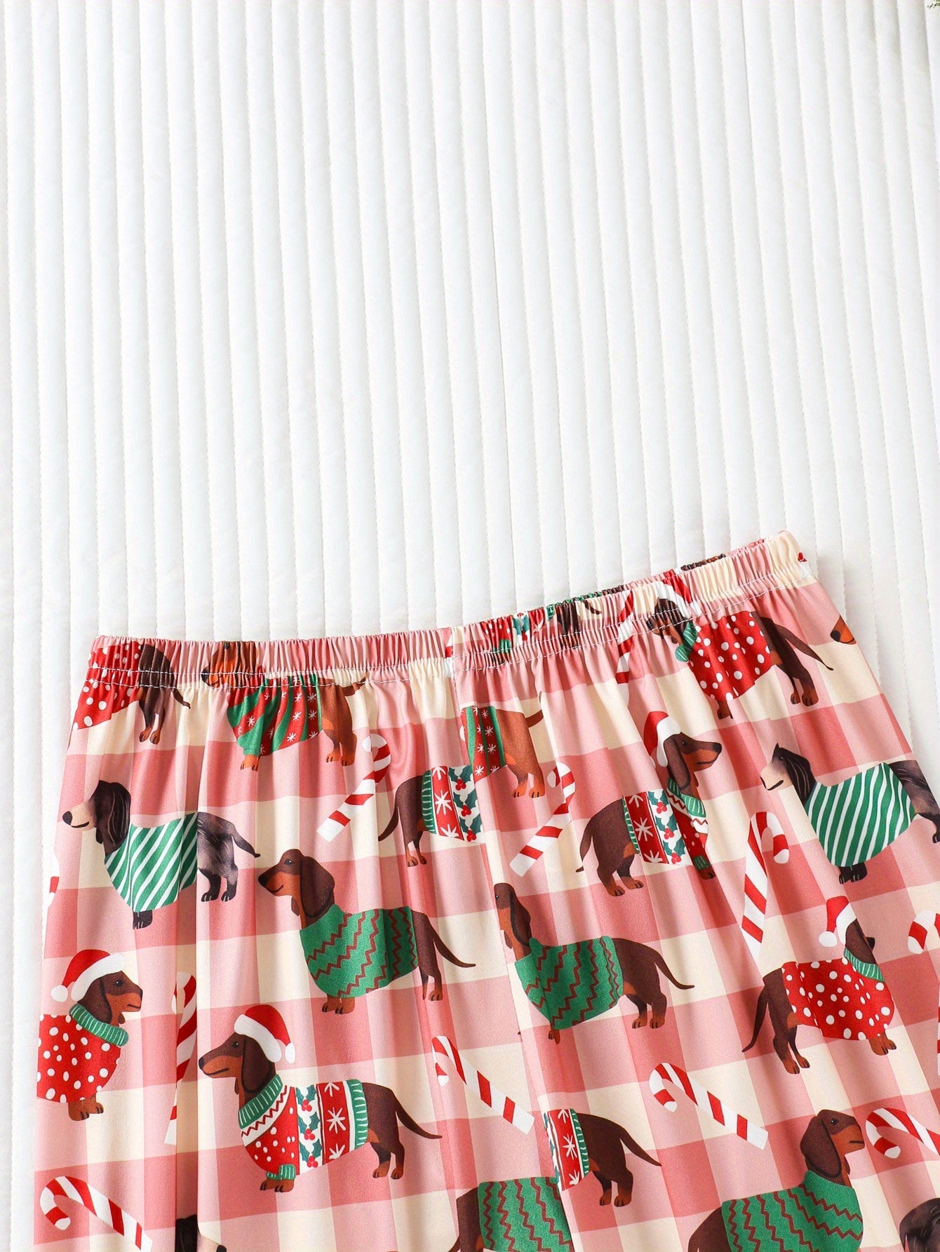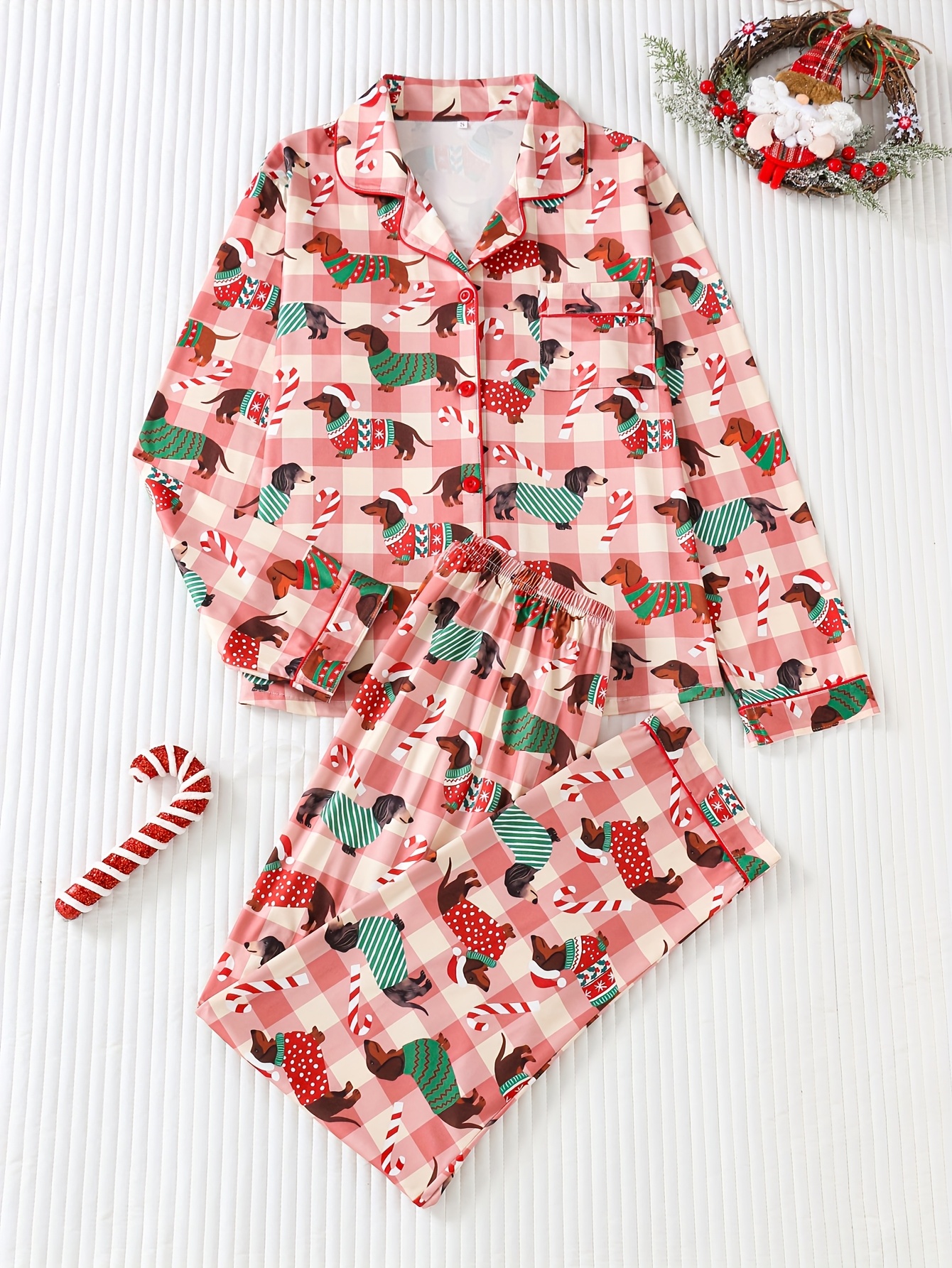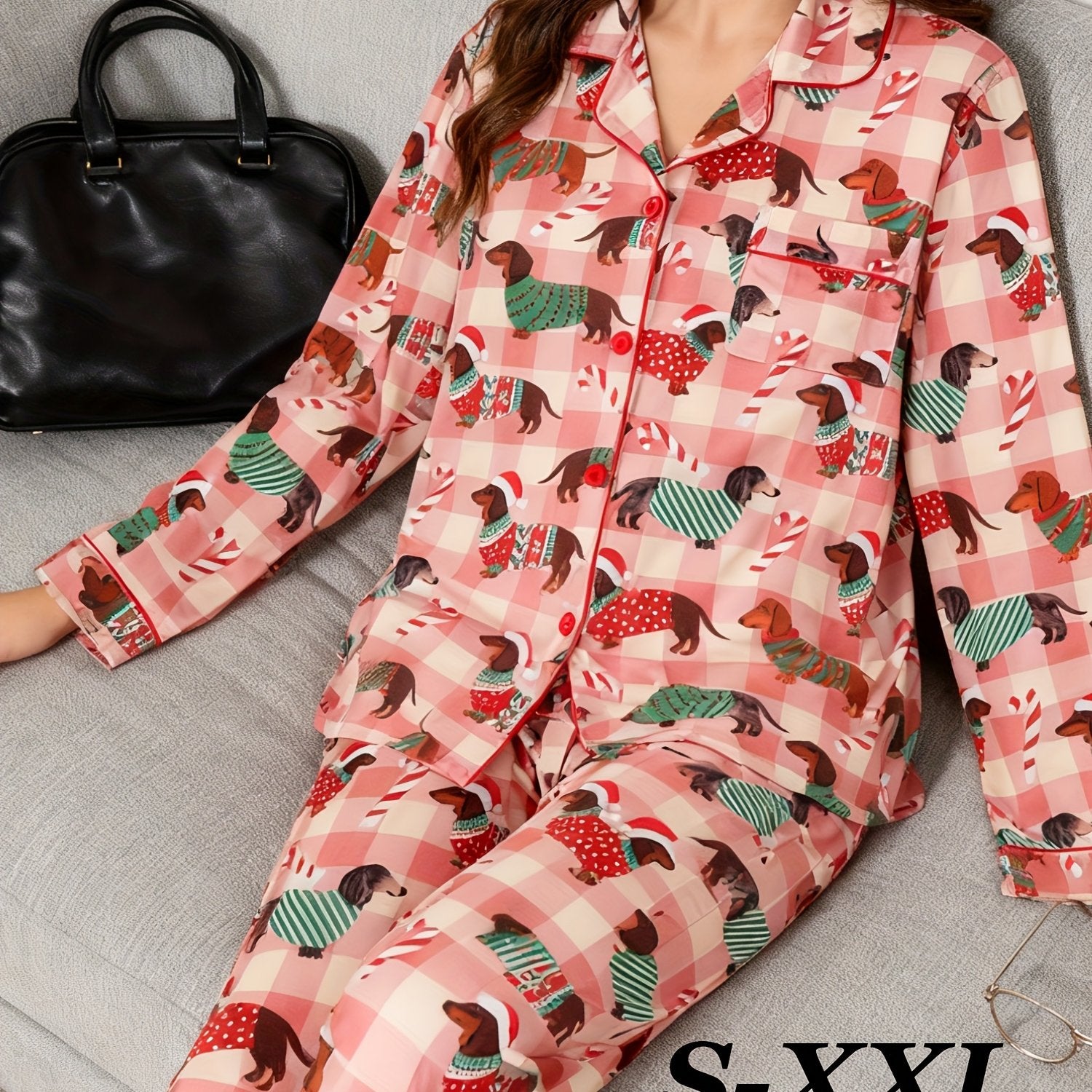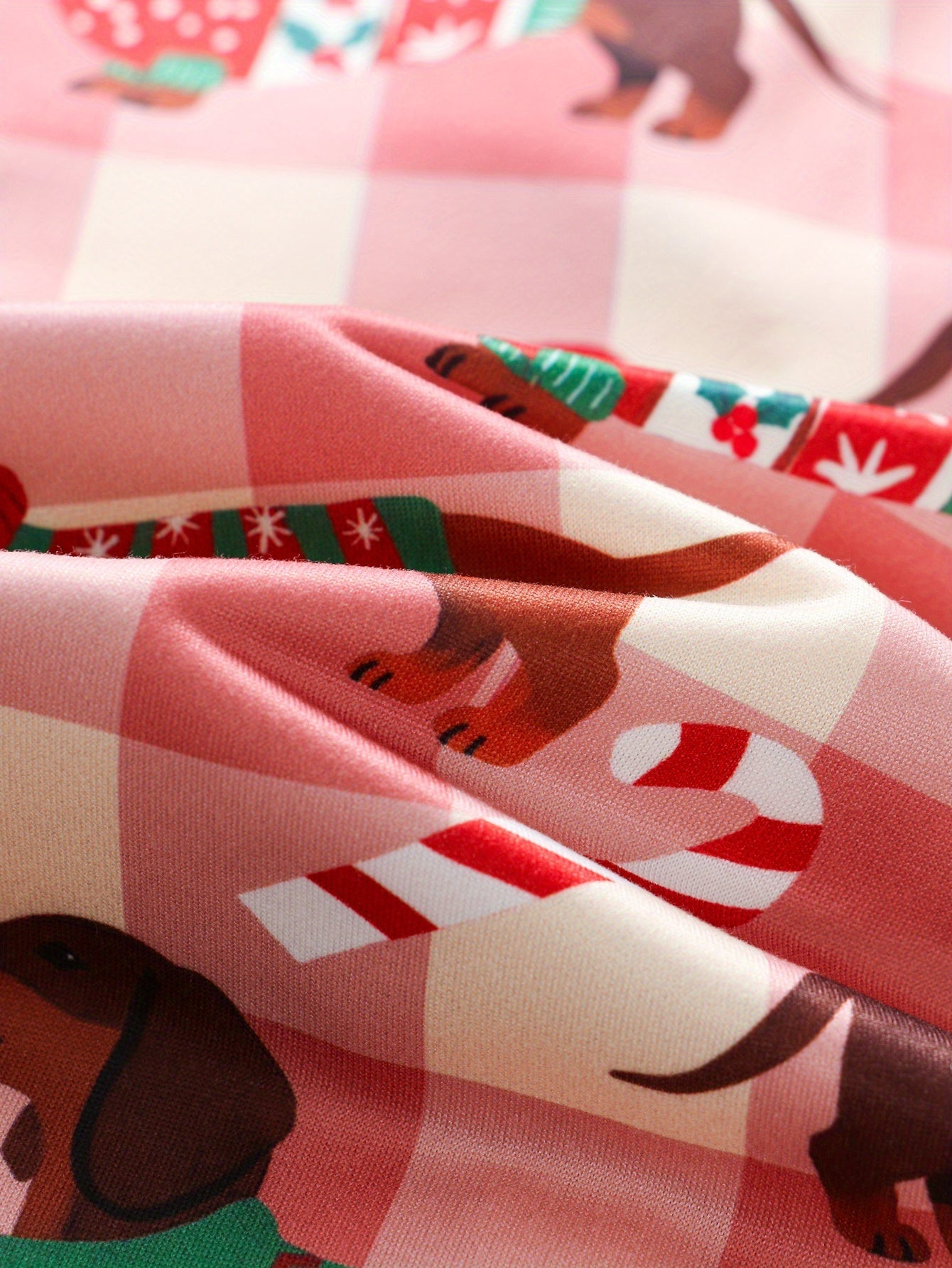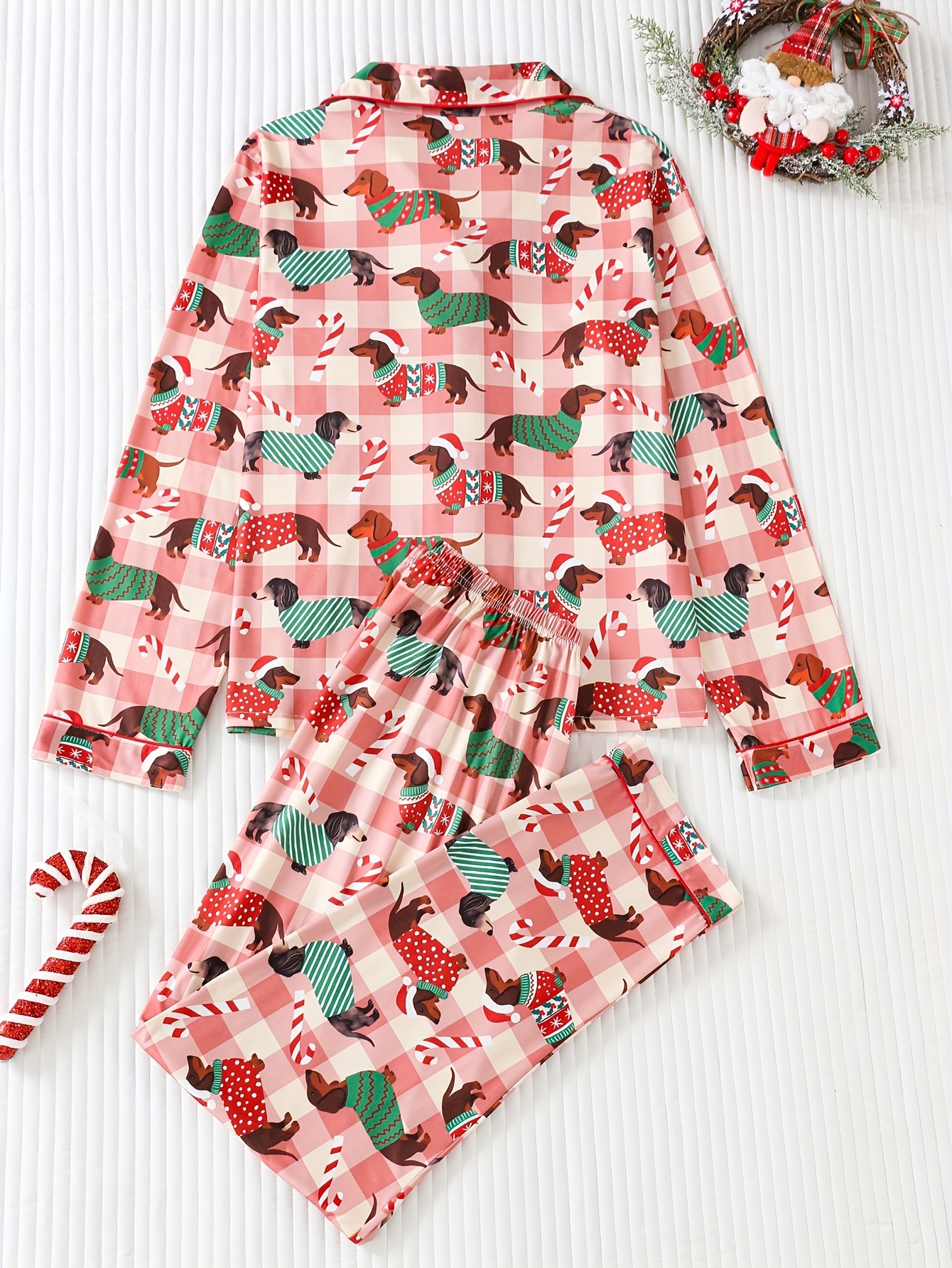 Ensemble pyjama manches longues femme imprimé teckel, pyjama vichy rose festif, cadeau idéal pour les amoureux des chiens, pour une séance photo de famille le matin de Noël